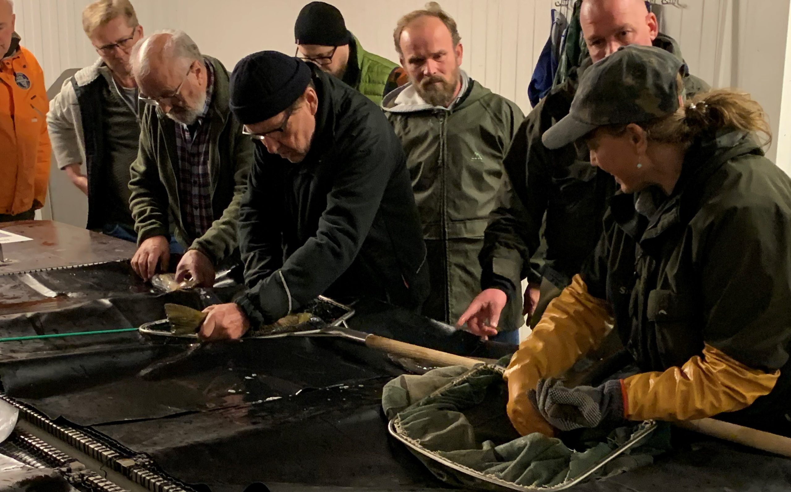 Stort set alle indbudte elfiskere havde taget imod tilbuddet om lidt ekstra uddannelse, og efter en kort intro, og lidt hygge over en pizza, blev der følt på umodne fisk og besvaret en masse spørgsmål. Slutteligt fik elfiskerne lov til at stryge de godt 50 hunner (og 50 hanner) der på daværende tidspunkt var klar til at sikre årets første æg i klækkebakkerne på Fyns Laksefisk.